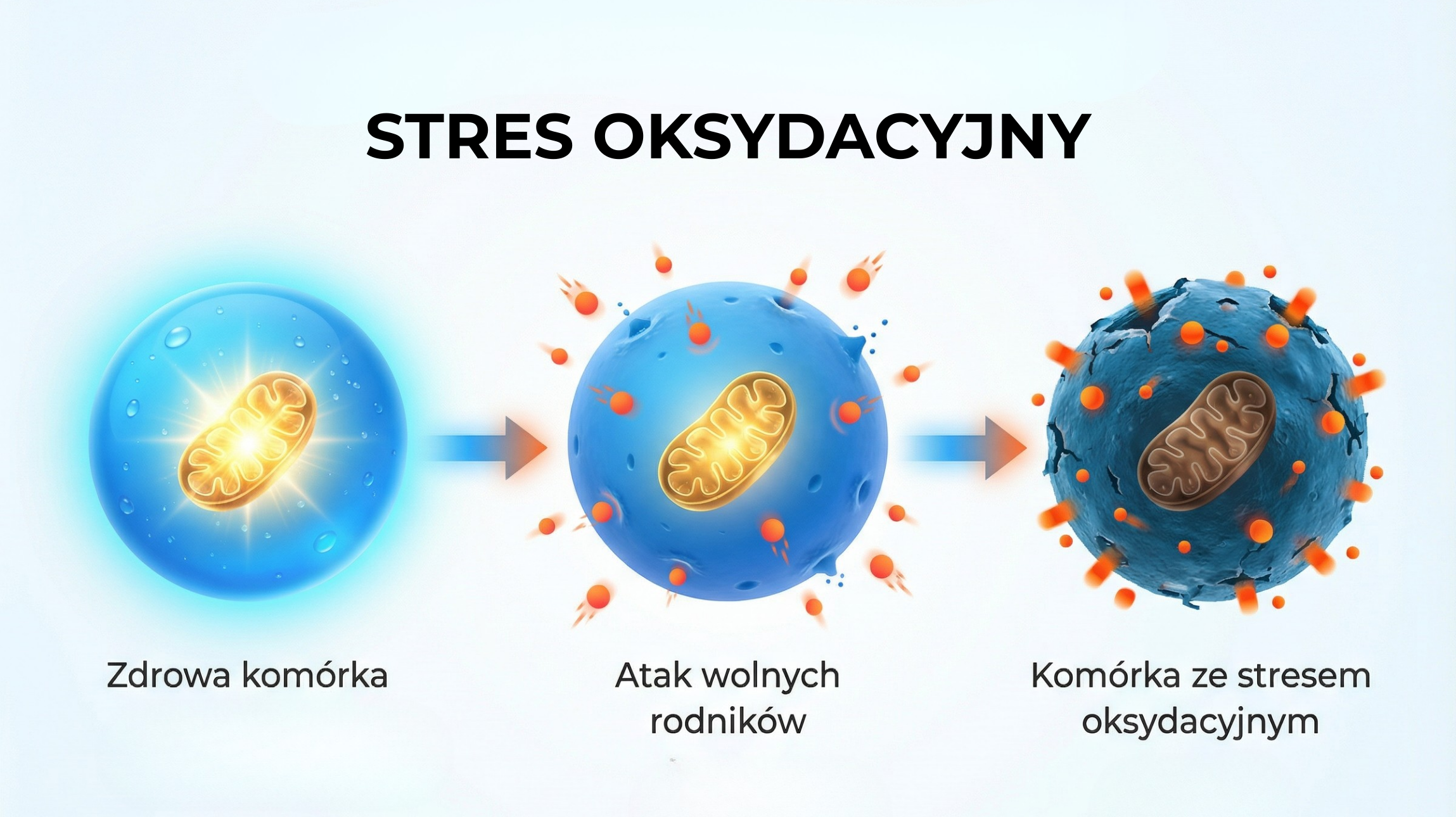 Woda musi przeniknąć przez błony komórkowe, a to wymaga energii i odpowiednich warunków. Jeśli twoje komórki są przeciążone wolnymi rodnikami (tymi samymi cząsteczkami, które powodują stres oksydacyjny i starzenie), ich zdolność do przyjmowania wody drastycznie spada.